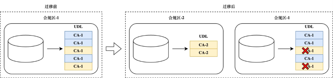 答案是否定的。直接使用合规区作为 UDL 在面临调整的时候会存在一定的限制。考虑图14所示的场景:原先所有来自合规区-1的用户,都被标记为 UDL=CA-1;由于法规变动导致 CA-1 中的部分用户不再属于该合规区(将这部分用户称为 USER_GROUP_B)。为了满足合规要求,需要: