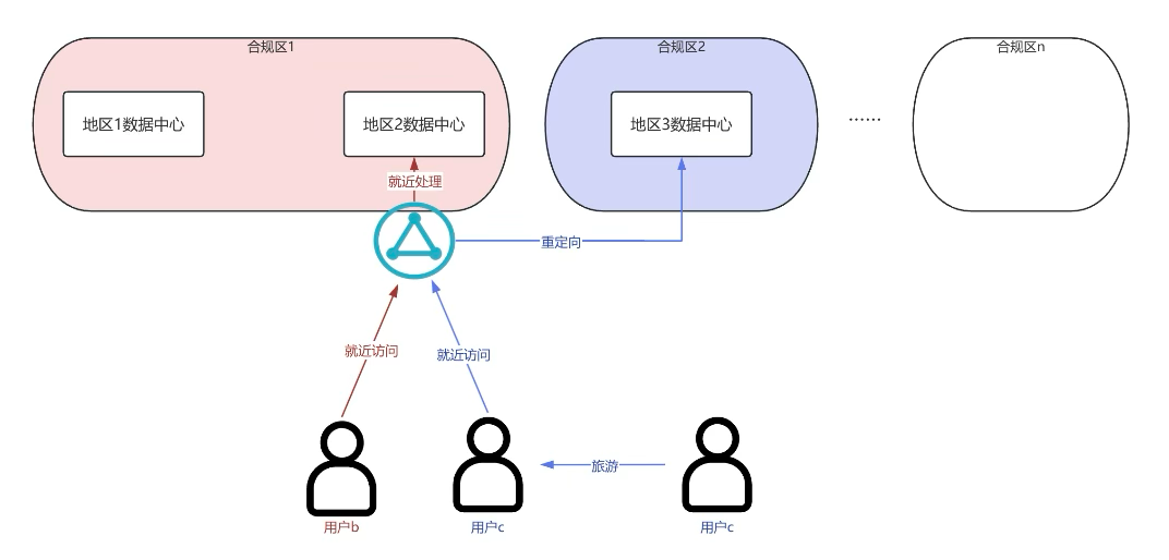 首先,对于用户数据,我们需要设计一种机制来标定用户的归属地,并确保他们的数据只在对应的合规区落地。当用户身处其他合规区发起访问时,系统需要识别区分用户,通过某种方式找到用户数据所在的合规区,将该用户所有请求都重定向回对应合规区进行处理,如图4所示。