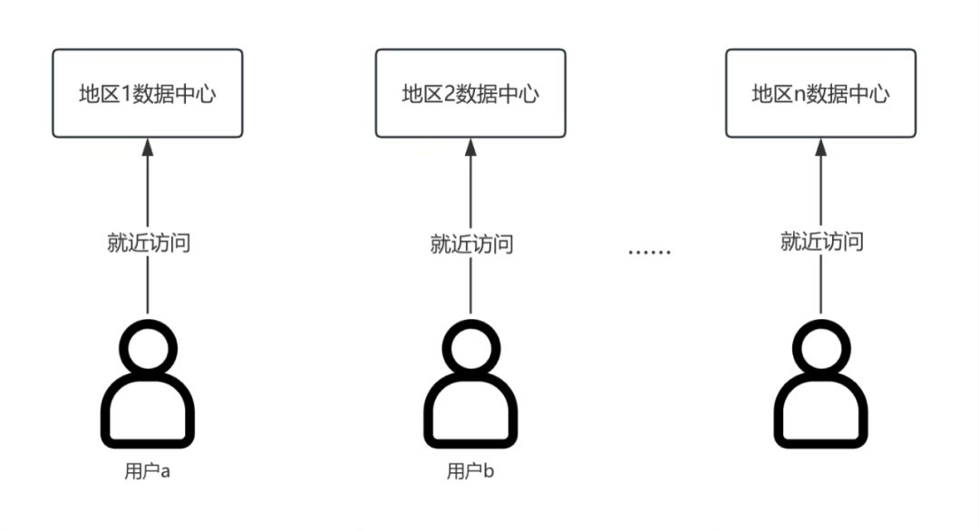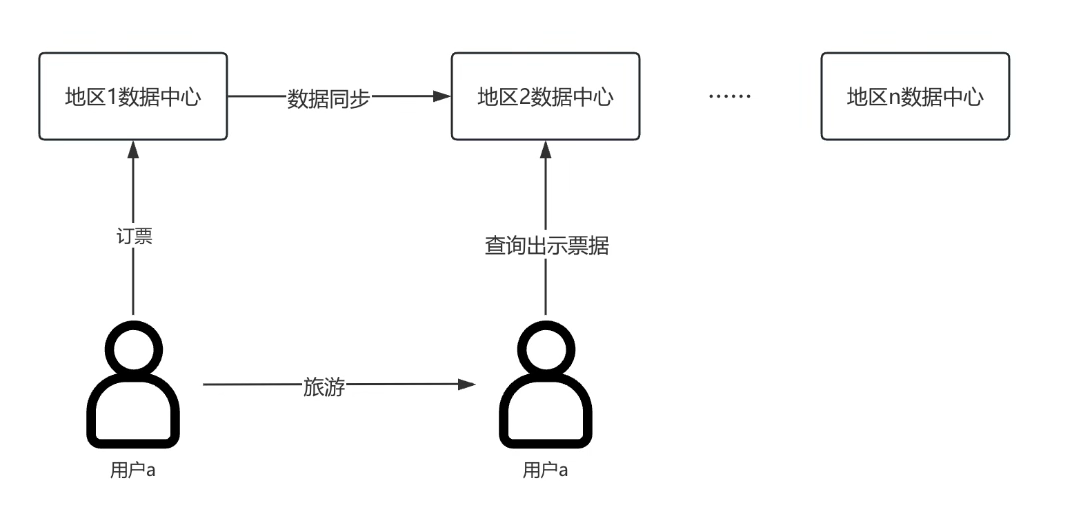 为了让讲解更清晰,这里以在线旅游业务为例。为了确保用户无论身处何地都能享受到高质量的在线旅游服务,最直接的方案就是在每个地区部署数据中心,做到每个用户都有一个物理距离上相对接近的服务节点,以规避物理距离带来的网络延迟与不稳定性,如图1所示。用户就近访问服务节点,延迟低、响应快,体验自然提升。