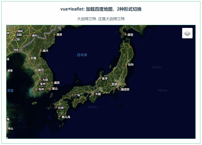 本示例演示如何在vue+leaflet加载百度地图,这里使用了control.layers进行切换两种不同的百度底图。这里要引用proj4,proj4leaflet等插件,另外在地图的中一定要设置:L.CRS.Baidu