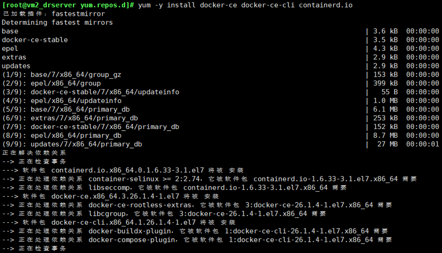 [root@vm2_drserver yum.repos.d]# yum -y install docker-ce docker-ce-cli containerd.io