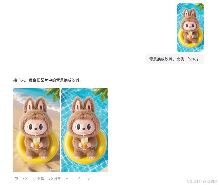 可以看到,豆包轻松实现了修改Labubu的背景图。看来,豆包的画图能力确实进化了很多。