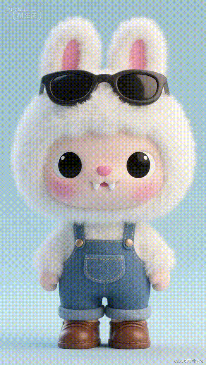 拉布布,泡泡玛特,卡通风格,拟人化角色,兔子耳朵,大眼睛,黑色瞳孔,尖牙齿,粉红色脸颊,头部及身体外层是白色毛绒材质,身穿蓝色牛仔背带裤和棕色皮鞋,头顶墨镜,毛绒绒的质感。