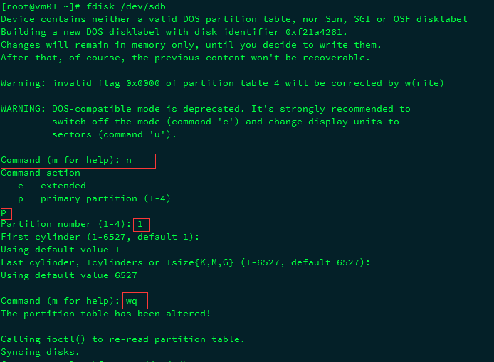 根据提示,依次输入"n","p" "1",两次回车,"wq",分区就开始了,很快就会完成。