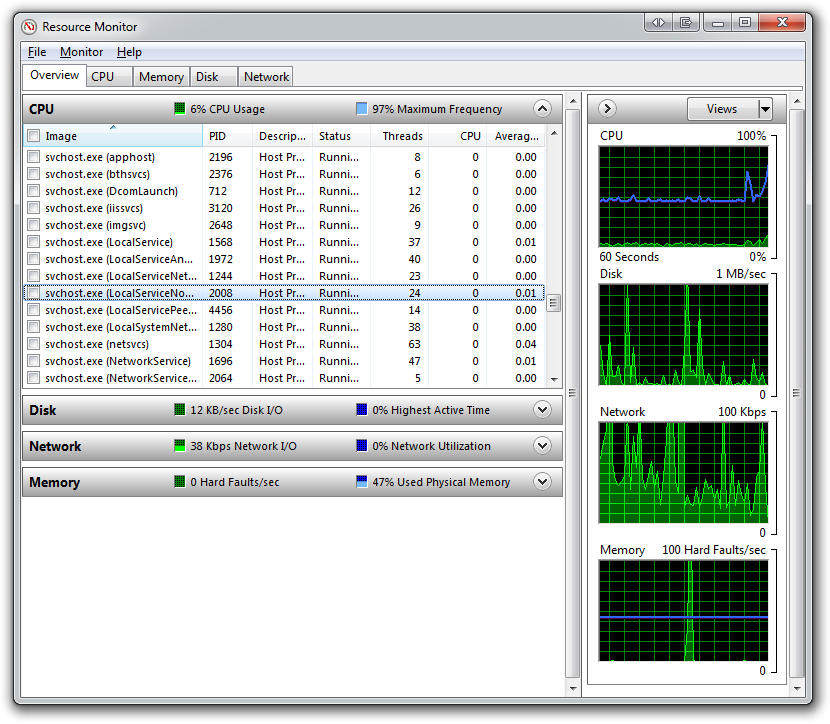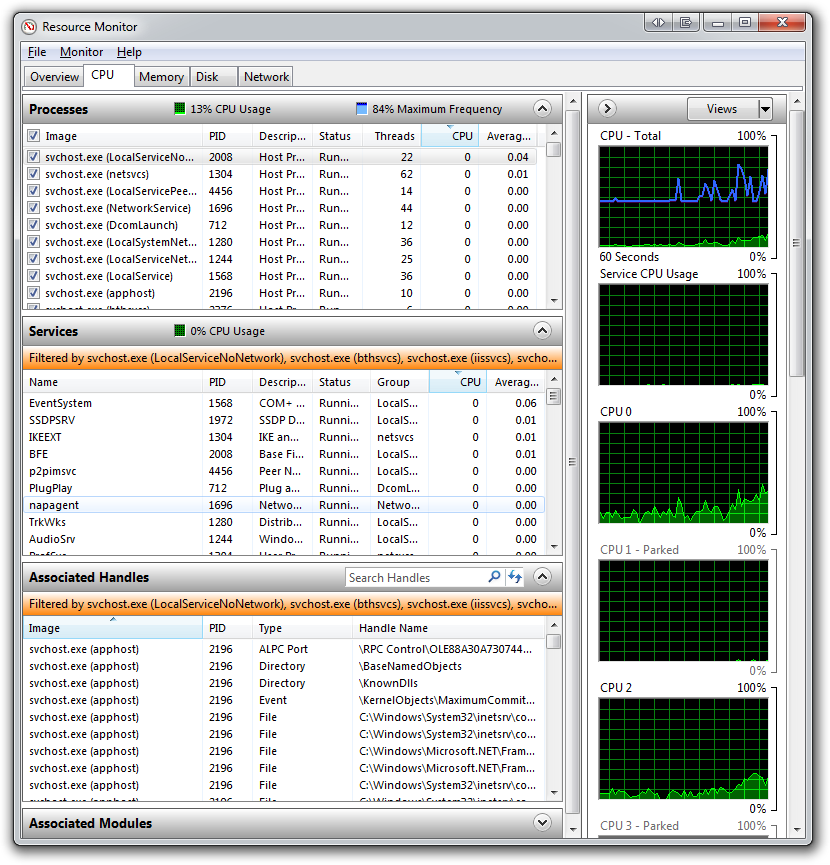 This inevitably leads you to questions like, "What Services are running inside what SvcHost.exe?" and "Which Service is using 100% CPU."