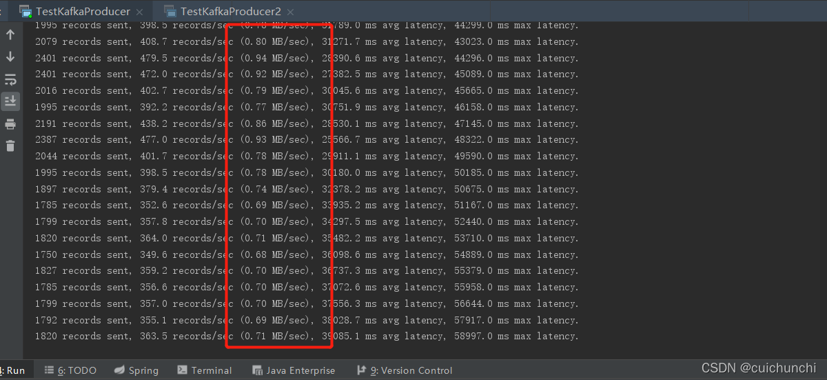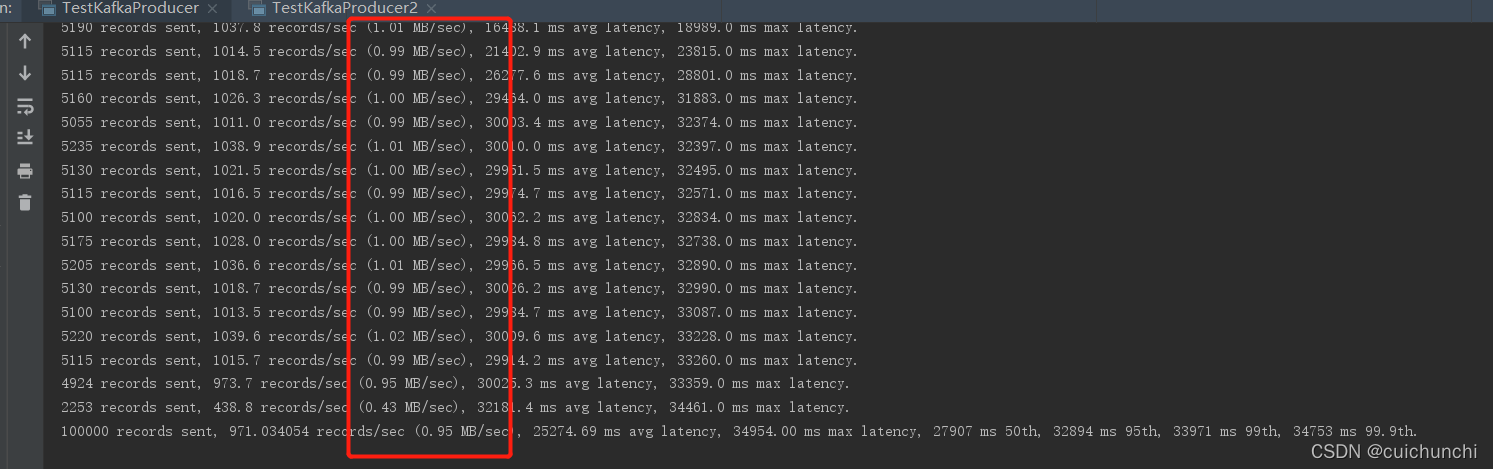 System.out.printf("%d records sent, %.1f records/sec (%.2f MB/sec), %.1f ms avg latency, %.1f ms max latency.%n",