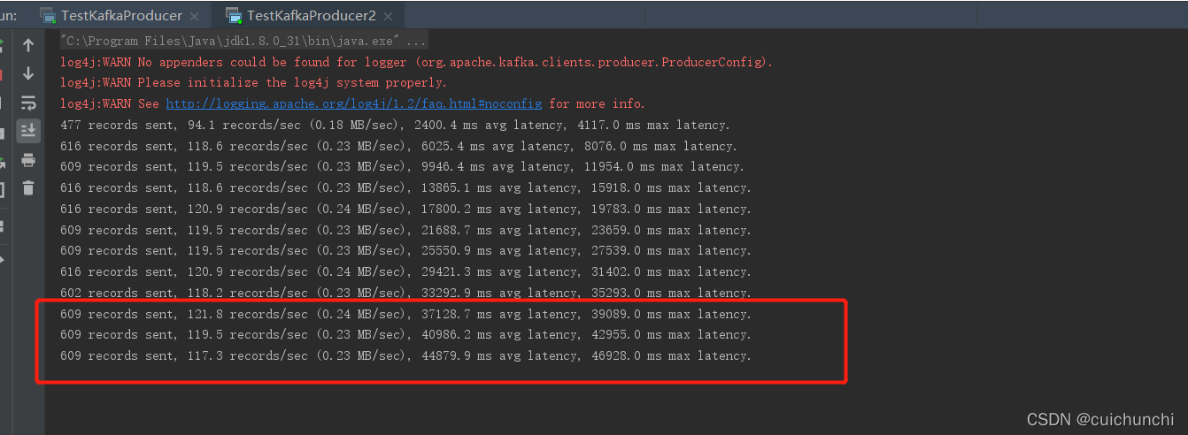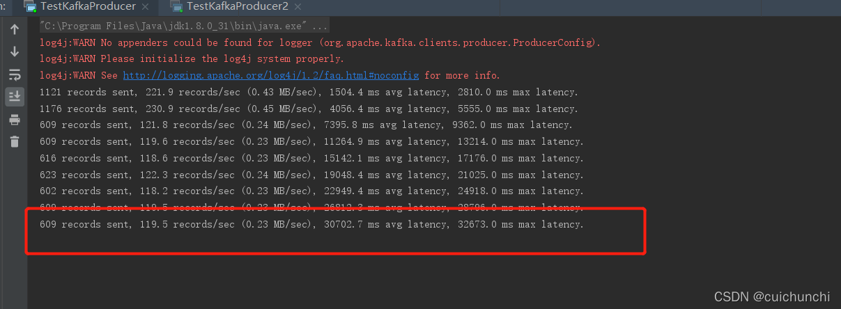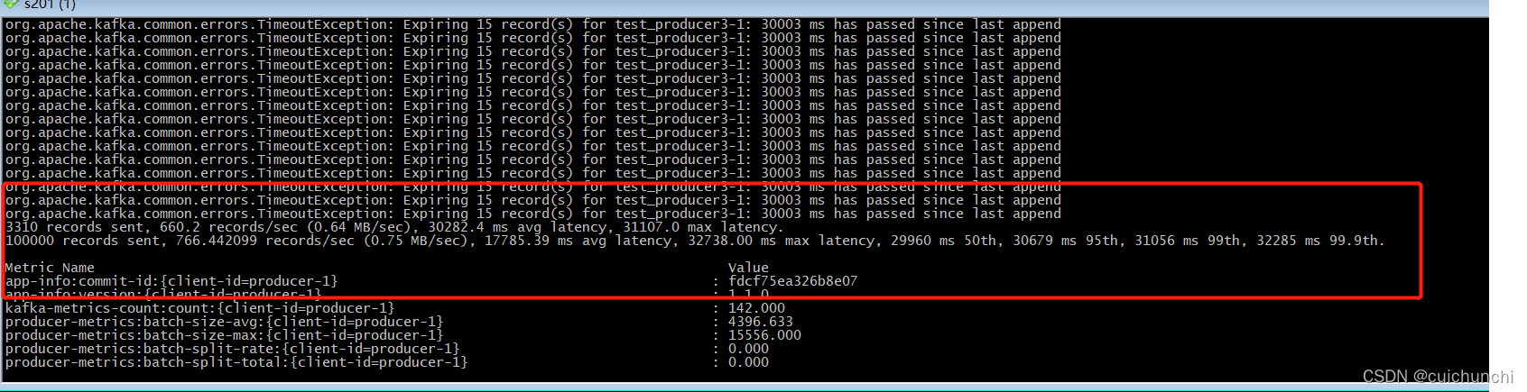 结果:producer-topic-metrics:record-error-total:{client-id=producer-1, topic=test_producer3} : 32080.000 (发送失败:32080)