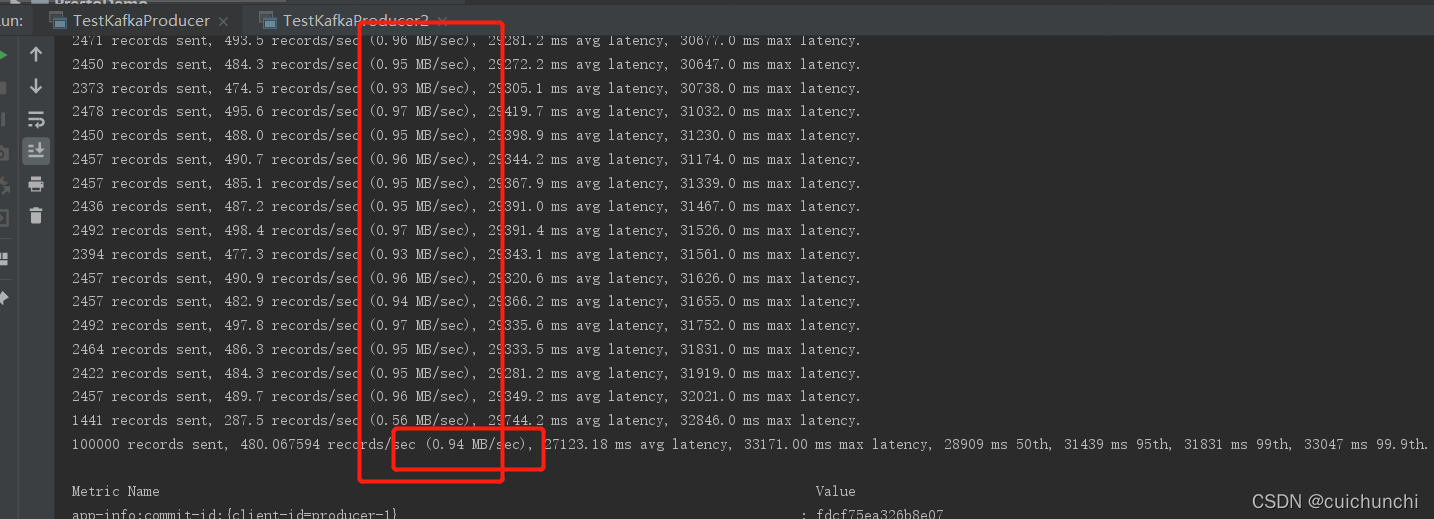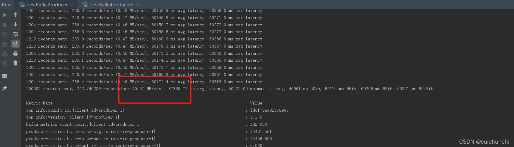 结果: producer-topic-metrics:record-send-total:{client-id=producer-1, topic=test_producer3_500} : 100000.000