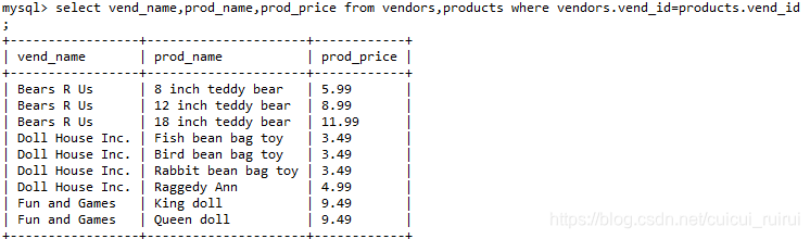 select vend_name,prod_name,prod_price from vendors inner join products on vendors.vend_id=products.vend_id;