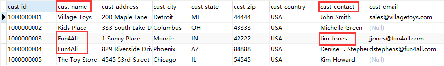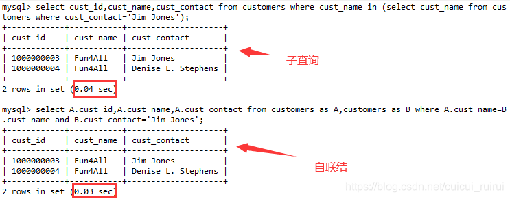 可以看到,这个检索是在同一个表中进行了两次搜索,自联结可以给同一个表多个不同的列名,进而检索。