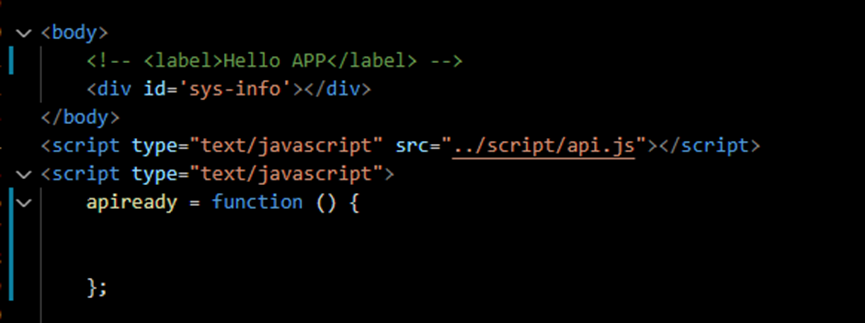 在使用模块之前,我们找到入口页面 main.html 的 apiready = function () 方法,把里面的内容清空。这个方法里面的属性内容就是最初页面上显示的那些属性,我们把里面的属性内容清空,之后把 body 里的 Hello APP 删除或者注释一下,然后保存。现在发现模拟器中的应用已经是空白了。