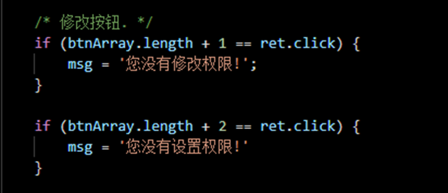 这段代码的意思是当我们点击按钮后的返回值如果是 btnArray 这个数组的长度 +1,那么就提示您没有修改权限。如果点击按钮后的返回值如果是 btnArray 这个数组的长度 +2,那么就提示您没有设置权限。