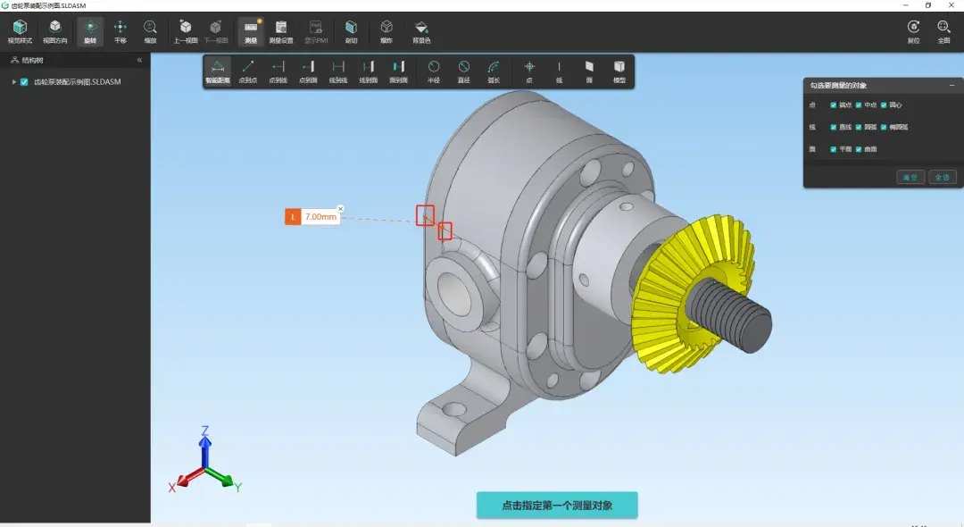 2、面到面:依照上述操作,点击两个平行的面,注意,当选择测量对象的时候, 点击错误时不显示,点击正确时,该区域会亮起。