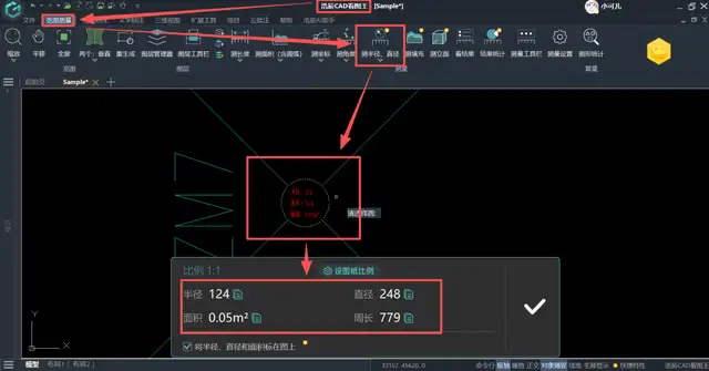 2、回到图纸界面,选中需要测量的圆或圆弧,该圆或圆弧的半径、直径、面积、周长就同时显示在图纸以及界面下方的对话框中了。