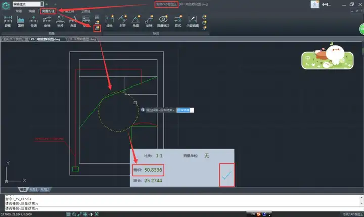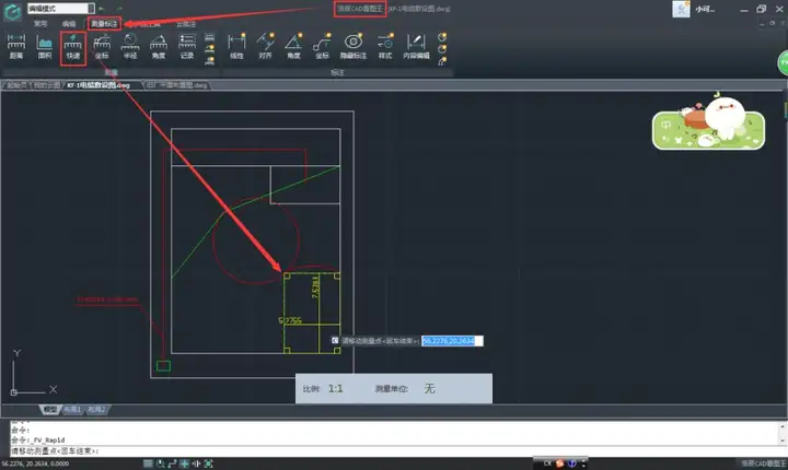 3、快速测量:选择快速测量后,鼠标放置在实体范围内就能测出相应的数据,如下图鼠标放置在矩形内部就显示出矩形的长宽。