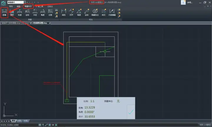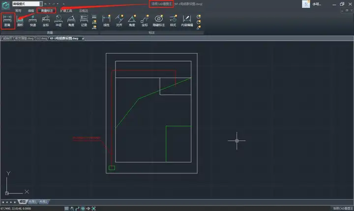 1.在浩辰CAD看图王电脑版界面上方点击“测量标注”,在“测量标注”菜单栏中选择“距离”测量。
