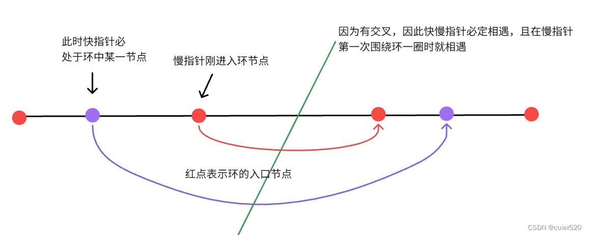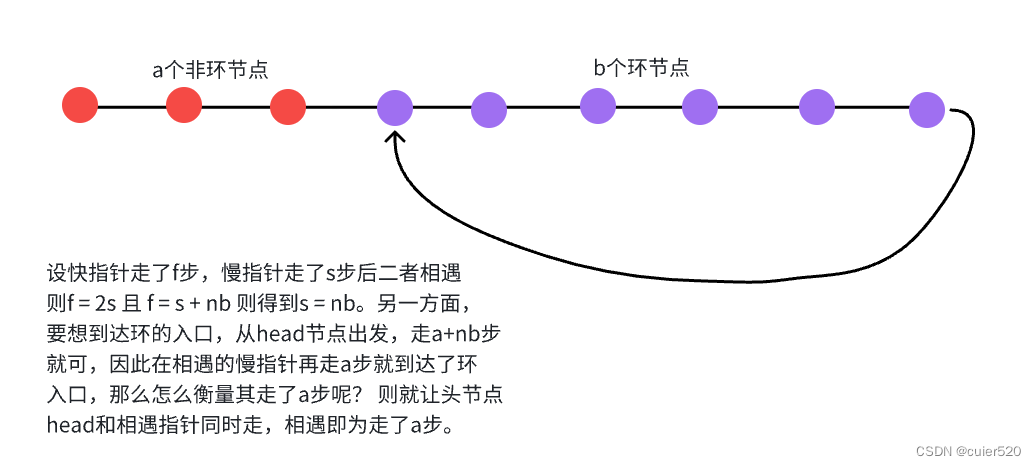 判断环是否存在:设定一快一慢指针,均从头节点出发,快指针一次走两步,慢指针一次走一步。若无环,则快指针会先到达空,返回False表示无环;若有环,则快慢指针必定相遇。前者无环快指针先到达空节点好理解,后者有环为什么快慢指针必定相遇呢?这里提供两种理解方式。