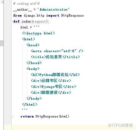 初始页面: # coding:utf-8 __author__ = 'Administrator' from django.http import HttpResponse def index(request): html = ''' 论坛首页