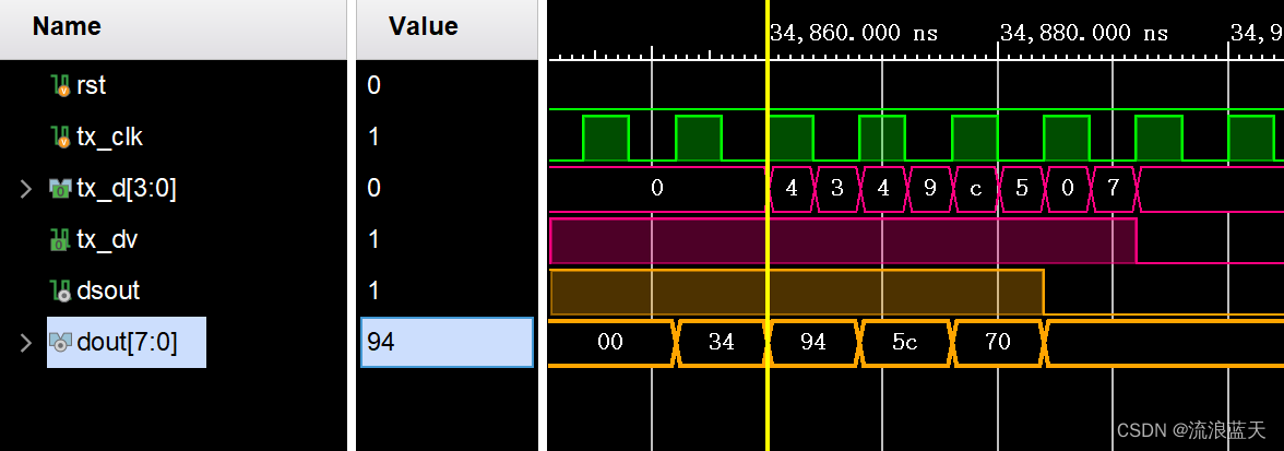 将CRC模块的输出dout[7:0]、dsout和ODDR模块的输出信号tx_dv、tx_d[3:0]丢进ILA,抓取数据波形如下图。可以看到CRC计算结果已经添加在数据帧的末尾,为0x34945c70。经ODDR模块转换为DDR信号tx_d[3:0],在tx_clk的上升沿输出数据的低四位,下降沿输出数据的高四位。