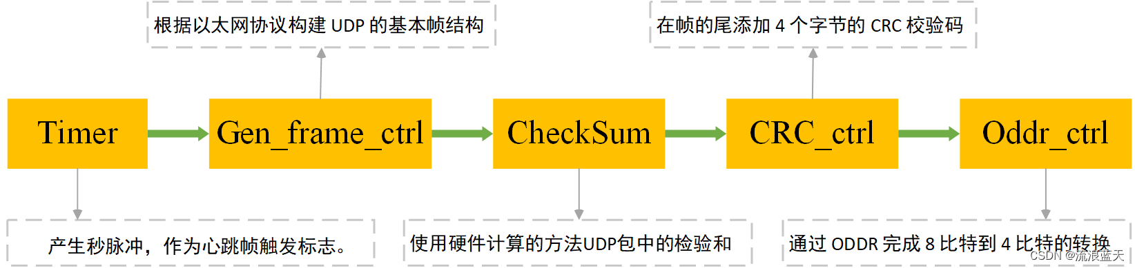 在上一篇千兆以太网数据发送(二):IP、UDP检验和计算中,我们完成了IP校验和、UDP校验和的计算,并将计算结果填充在以太网协议帧中的对应位置,输出数据信号check_data[7:0]和数据有效信号check_en。至此,完成了下图中发送链路timer模块、gen_frame_ctrl模块和check_sum模块,但是CRC字段都给的0。本文将在此基础上计算出CRC校验和,进一步完善以太网数据包。