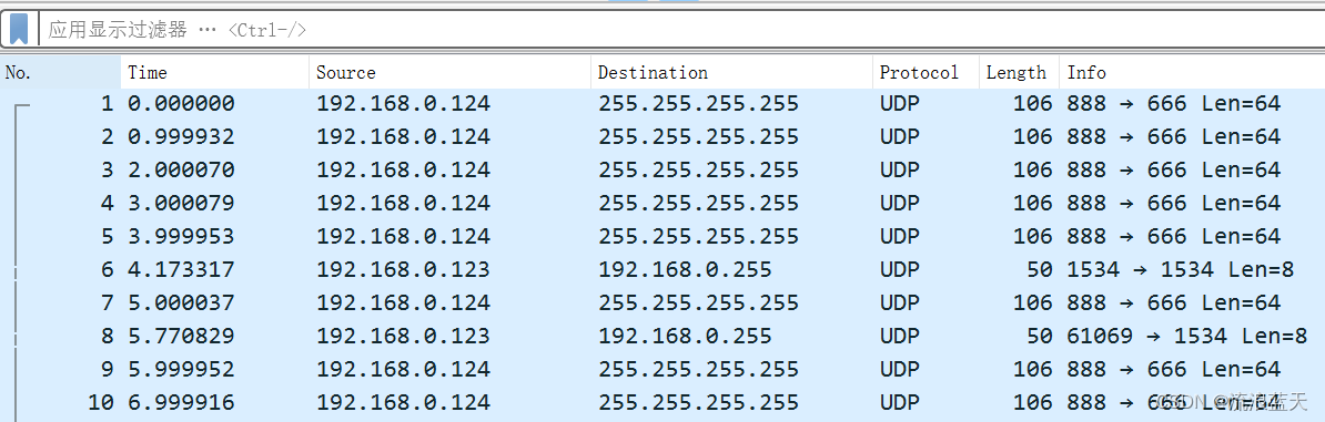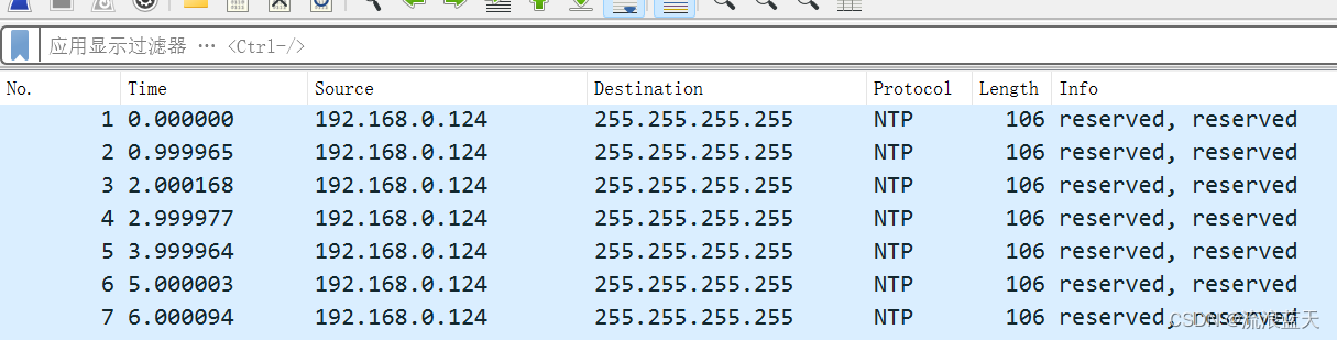 可以发现抓到的包虽然是以1S为间隔的,但是并不是UDP包,而是NTP包,这是为什么呢?查阅资料后得知, NTP 是用来同步计算机系统时钟的协议,它通过网络获取和同步各个计算机的时钟。并且NTP 使用UDP作为传输协议,通常在UDP的端口号123上运行。既然这样,回去把上位机端口号修改成666,将FPGA端口号修改为888,重新抓包后如下图: