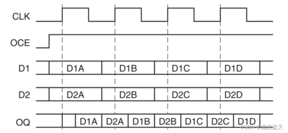 D1 和 D2:分别是“ C”时钟上升沿和下降沿同步输入的 SDR 数据;