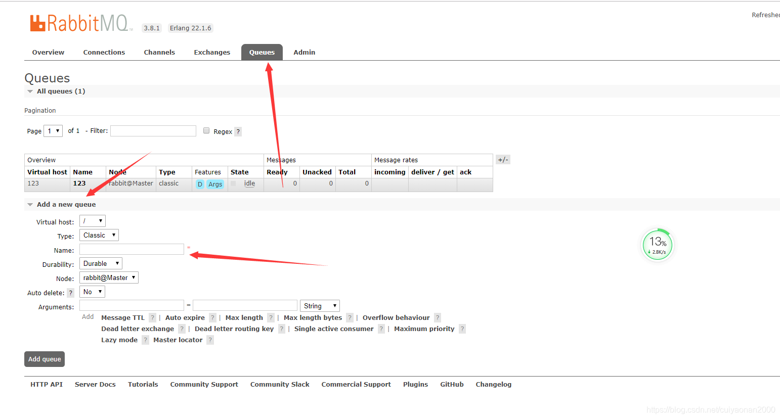 可登陆管理控制台(启用management plugin的情况下),同时可以查看rabbitmq节点的相关信息(进程数,内存使用情况,磁盘使用情况等)