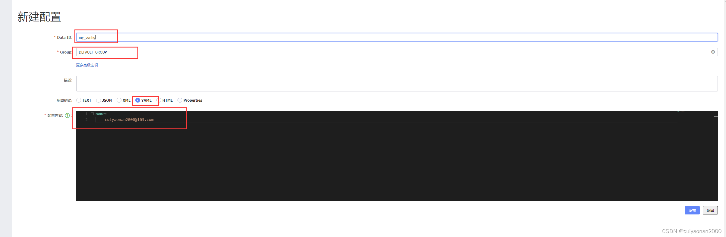 如上所示dataid是我们工程选择要用那个配置文件的主键,只有配置对了dataid 才能获取到对应的配置信息内容cuiyaonan2000@163.com