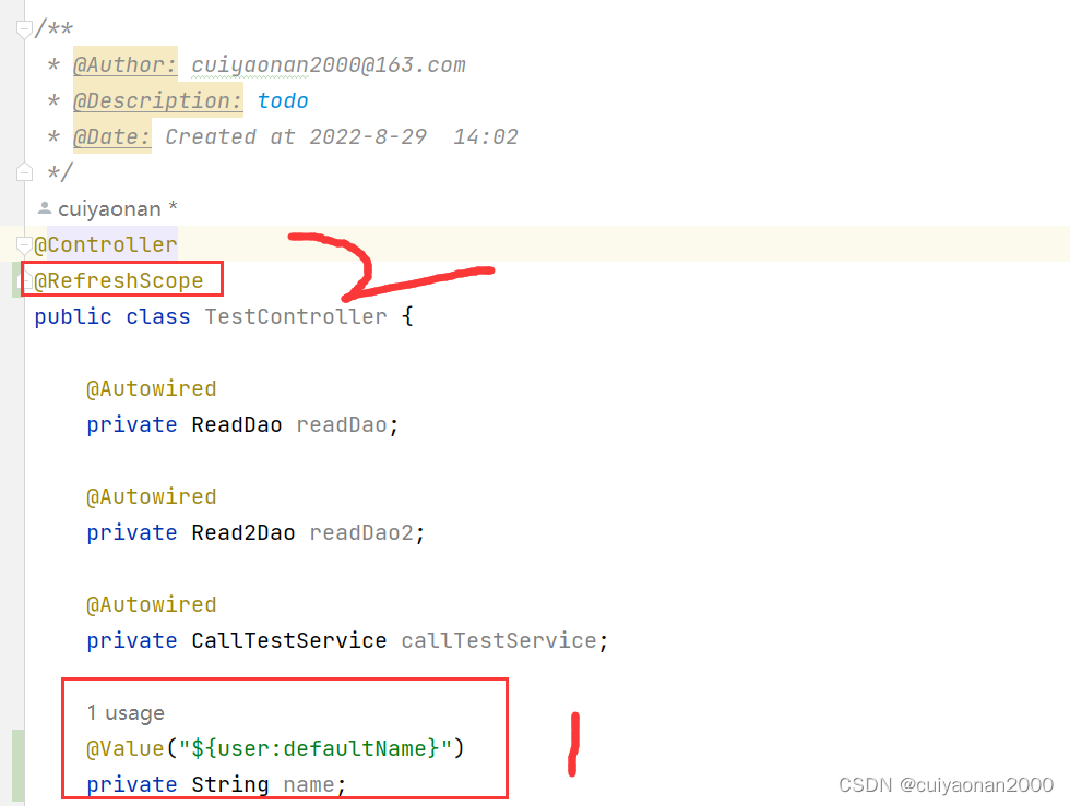 代码中的使用跟我们常用的获取配置信息是一样的.如下1所示,2的注解表示会动态的获取最新的配置信息
