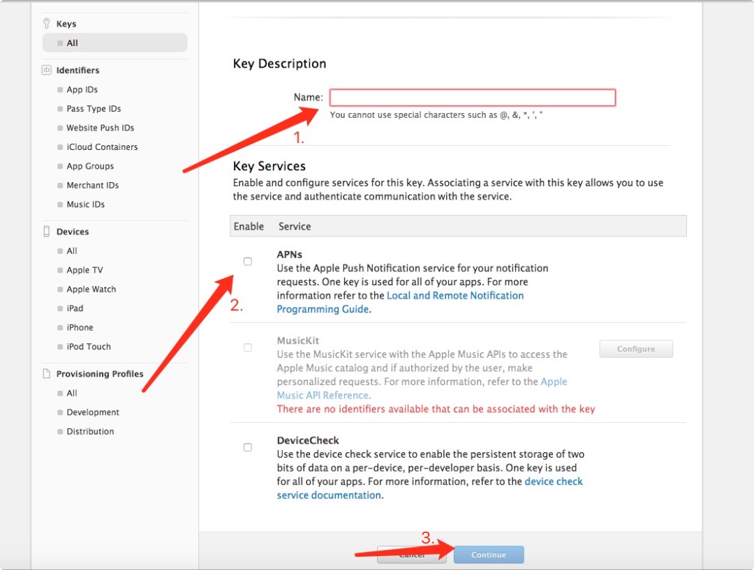 .p8 文件生成:登录开发者账号,进入Certificates, Identifiers & Profiles 面板,左侧菜单栏选中Keys ,点击右侧 + 号按钮,生成如图文件创建页面,,输入文件名,勾选APNs,点击continue,直到生成.p8文件