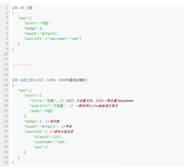 String payload = "{ \"aps\" : {\"alert\" : \"测试\", \"sound\" : \"default\", \"badge\" :1},\"cuiyaonan2000\":\"cuiyaonan2000\" }";