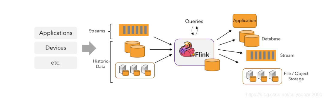 Flink 应用程序可以消费来自消息队列或分布式日志这类流式数据源(例如 Apache Kafka 或 Kinesis)的实时数据,也可以从各种的数据源中消费有界的历史数据。同样,Flink 应用程序生成的结果流也可以发送到各种数据汇中。(如下图所示)