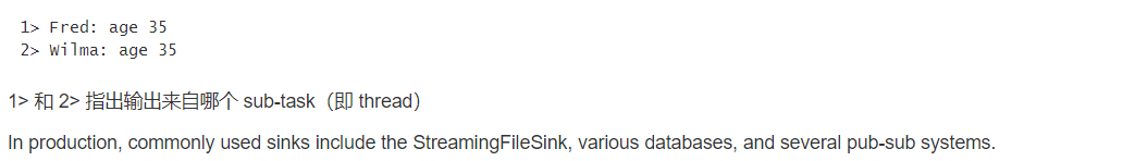 上述示例用 adults.print() 打印其结果到 task manager 的日志中(如果运行在 IDE 中时,将追加到你的 IDE 控制台)。它会对流中的每个元素都调用 toString() 方法。