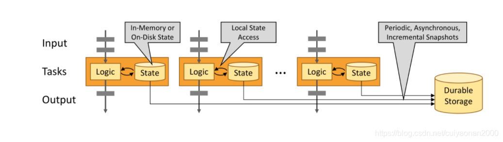 Flink 应用程序的状态访问都在本地进行,因为这有助于其提高吞吐量和降低延迟。通常情况下 Flink 应用程序都是将状态存储在 JVM 堆上,但如果状态太大,我们也可以选择将其以结构化数据格式存储在高速磁盘中。