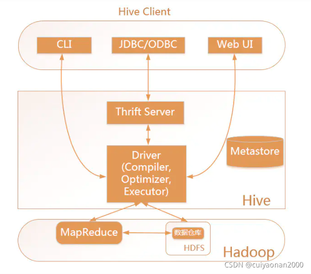 - Client: Client 是 hive 的客户端,用户连接至 hive Server。在启动 Client 模式的时候,需要指出 hive Server 所在节点,并且在该节点启动 hive Server。即通过JDBC/ODBC连接到Hive.JDBC/ODBC:是 Hive 的 Java 实现,与传统数据库 JDBC 类似, 用户(开发员、运维人员) 通过这连接至 Hive Server