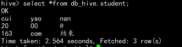 hive> create table db_hive.student(cui string ,yao string ,nan string) row format delimited fields terminated by '\t';