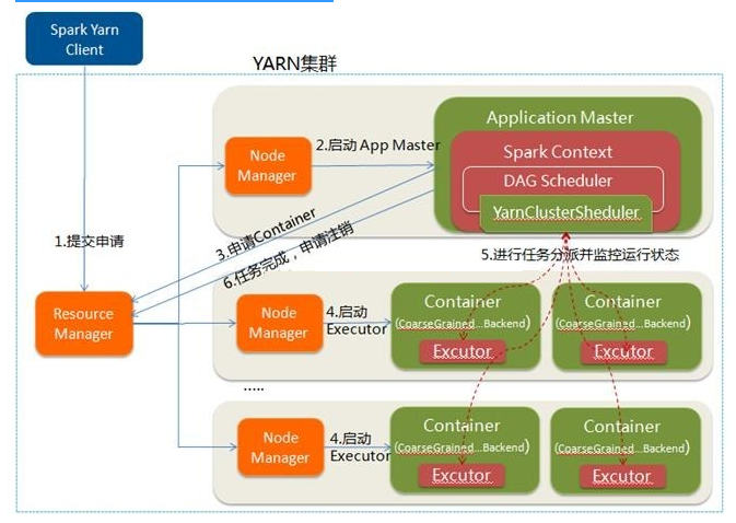 - ApplicationMaster中的SparkContext分配Task给CoarseGrainedExecutorBackend执行,CoarseGrainedExecutorBackend运行Task并向ApplicationMaster汇报运行的状态和进度,以让ApplicationMaster随时掌握各个任务的运行状态,从而可以在任务失败时重新启动任务