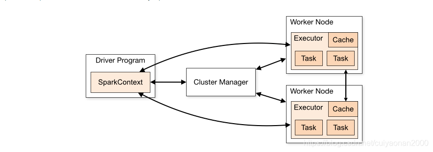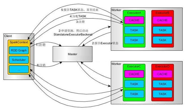- client中的SparkContext分配Task给CoarseGrainedExecutorBackend执行,CoarseGrainedExecutorBackend运行Task并向Driver汇报运行的状态和进度,以让Client随时掌握各个任务的运行状态,从而可以在任务失败时重新启动任务