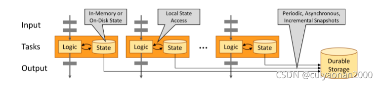 Flink 应用程序的状态访问都在本地进行,因为这有助于其提高吞吐量和降低延迟。通常情况下 Flink 应用程序都是将状态存储在 JVM 堆上,但如果状态太大,我们也可以选择将其以结构化数据格式存储在高速磁盘中。(这里注意不同的算子,相同算子的并行子任务是无法共享状态的cuiyaonan2000@163.com)