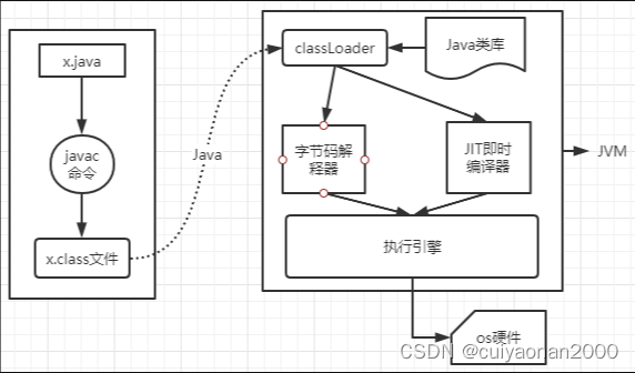 一般情况下我们自己写代码的时候会用到Java的类库,所以在加载的时候也会把Java类库相关的类也加载到内存中。装载完成之后会调用字节码解释器和JIT即时编译器来进行解释和编译,编译完之后由执行引擎开始执行,执行引擎下面对应的就是操作系统硬件了。
