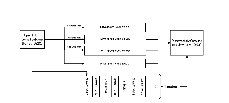 如果有延迟到达的数据(事件时间为9:00的数据在10:20达到,延迟 >1 小时),我们可以看到upsert将新数据生成到更旧的时间段/文件夹中。 在时间轴的帮助下,增量查询可以只提取10:00以后成功提交的新数据,并非常高效地只消费更改过的文件,且无需扫描更大的文件范围,例如07:00后的所有时间段。