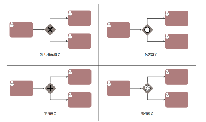 - 包容网关:可以同时执行多条线路,也可以在网关上设置条件