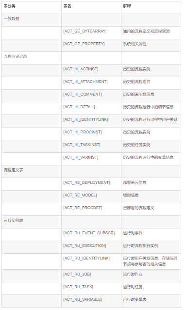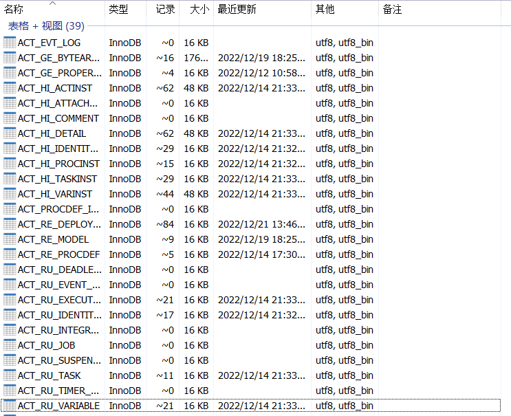 观察创建的表,我们发现 Activiti 的表都以 act_ 开头,紧接着是表示表的用途的两个字母标识,也和 Activiti 所提供的服务的 API 对应:
