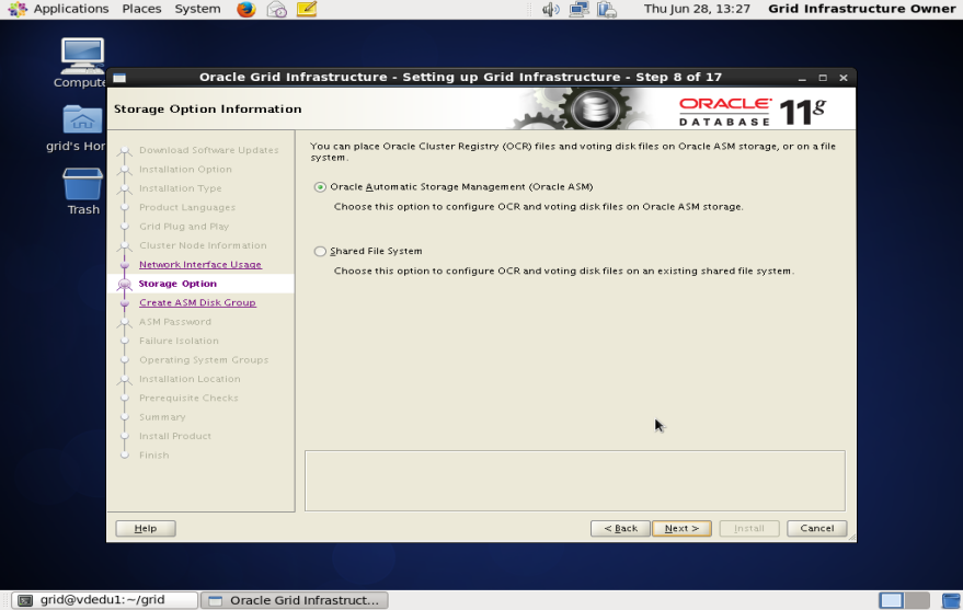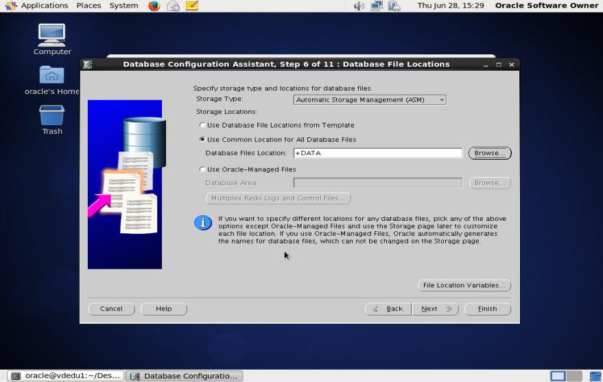 Database file locations( 数据库文件位置 ) 选择 Automatic Storage Management ( ASM )(自动存储管理)作为 Storage Type( 存储类型 ). 选择 Use common location for all database files (所有数据库文件使用公共位置) 然后选择 DATA 磁盘组