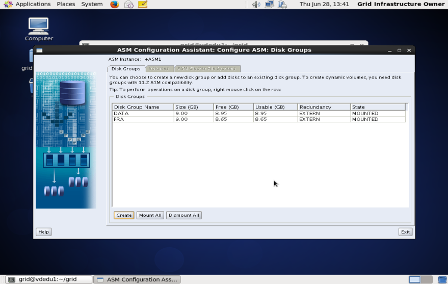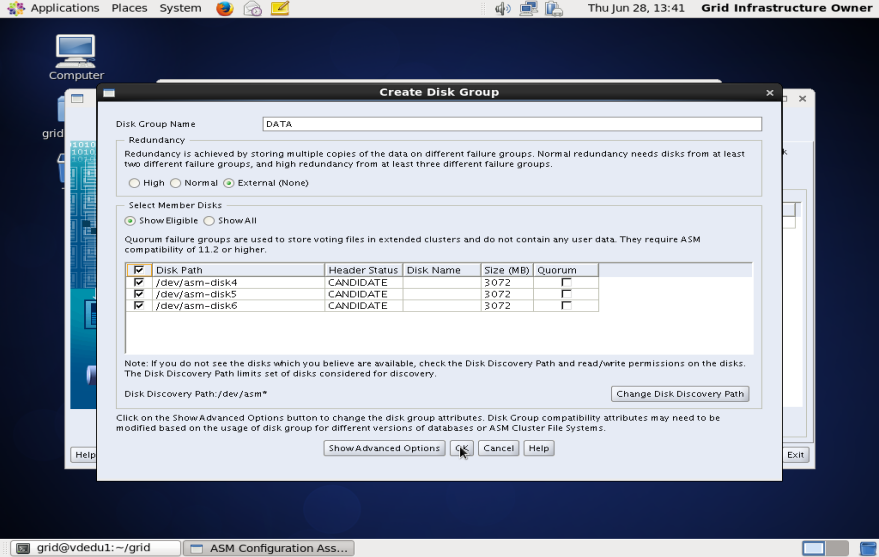 此时直接启用dbca配置可能会无法发现磁盘组,我们需要进入grid家目录执行chmod +s权限,使ORACLE用户可以看到磁盘组