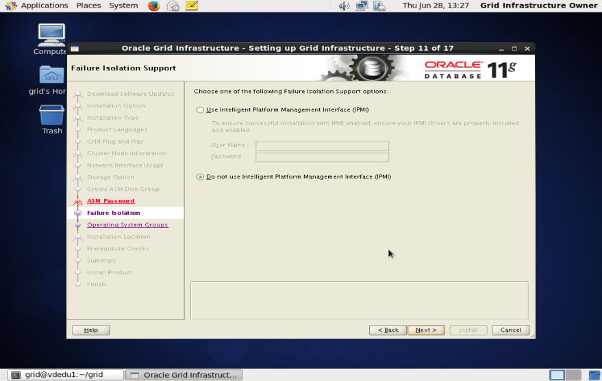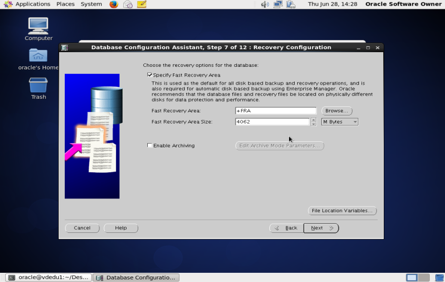 在 recovery configuration( 恢复配置 ), 选中 specify flash recovery( 指定快速恢复区 ) 选择 +FRA 磁盘组,并确保 Flash Recovery Area size (快速恢复区大小)为 4062MB