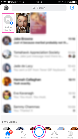 Facebook is actively encouraging people to use Messenger Day, so posting to it from the Messenger app is easy. Either tap the Add to Messenger Day button or the circle at the bottom of the screen. This brings up Messenger’s camera.