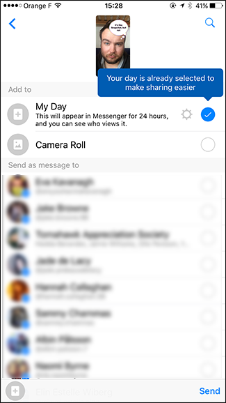 准备发布照片时,请点击箭头。 Messenger Day将自动被选择。 您可以通过选择相机胶卷将照片保存到手机中。 您还可以将照片作为消息发送给您的任何朋友。 点击发送,照片将被发布。