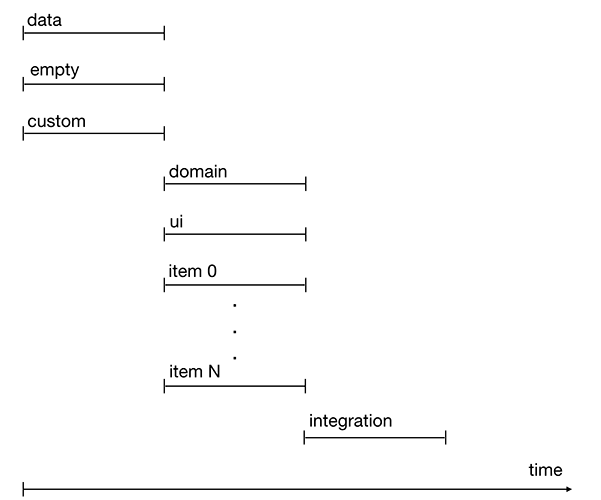 For each specific functionality, the set of tasks can vary. There may be a different number of tasks empty, ui, item and integration, and some types may simply be absent.