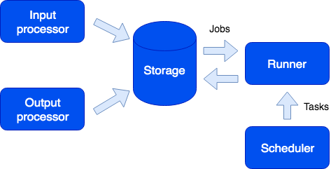 在这里,我们可以看到另一个名为Runner的角色。 这个角色没有状态; 如有必要,可以将更多具有该角色的应用程序实例添加到群集中。 跑步者负责完成任务。 正如我已经提到的,可以从沙箱中创建新任务。 他们加入存储队列,然后在运行器上运行。 这种任务称为作业。 我们还有一个名为Task的任务类型,即用户定义的任务,可以按时(使用cron语法)或按需运行。 为了运行和跟踪此类任务,我们有一个方便的任务管理器。 必须启用调度程序角色才能使用此功能。 该角色具有状态,因此它不会扩展,而这是不必要的。 但是,像其他任何角色一样,如果主服务器突然发生故障,它可以具有一个可以开始工作的副本。